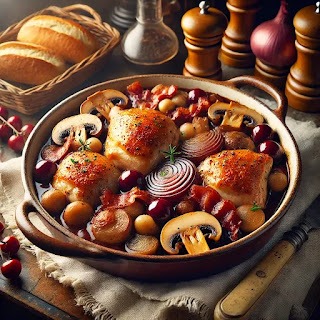 El Coq au Vin tiene sus raíces en la tradición campesina francesa, donde se utilizaban ingredientes simples para crear platos sustanciosos. Originalmente se preparaba con gallo ("coq"), cuya carne era más dura y requería una cocción prolongada. El vino tinto, un producto regional, aportaba profundidad y sabor al guiso.