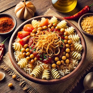 Montar el plato: En un plato grande, coloca una capa de arroz, seguida de lentejas, pasta y garbanzos. Vierte la salsa de tomate caliente por encima y decora con las cebollas fritas.